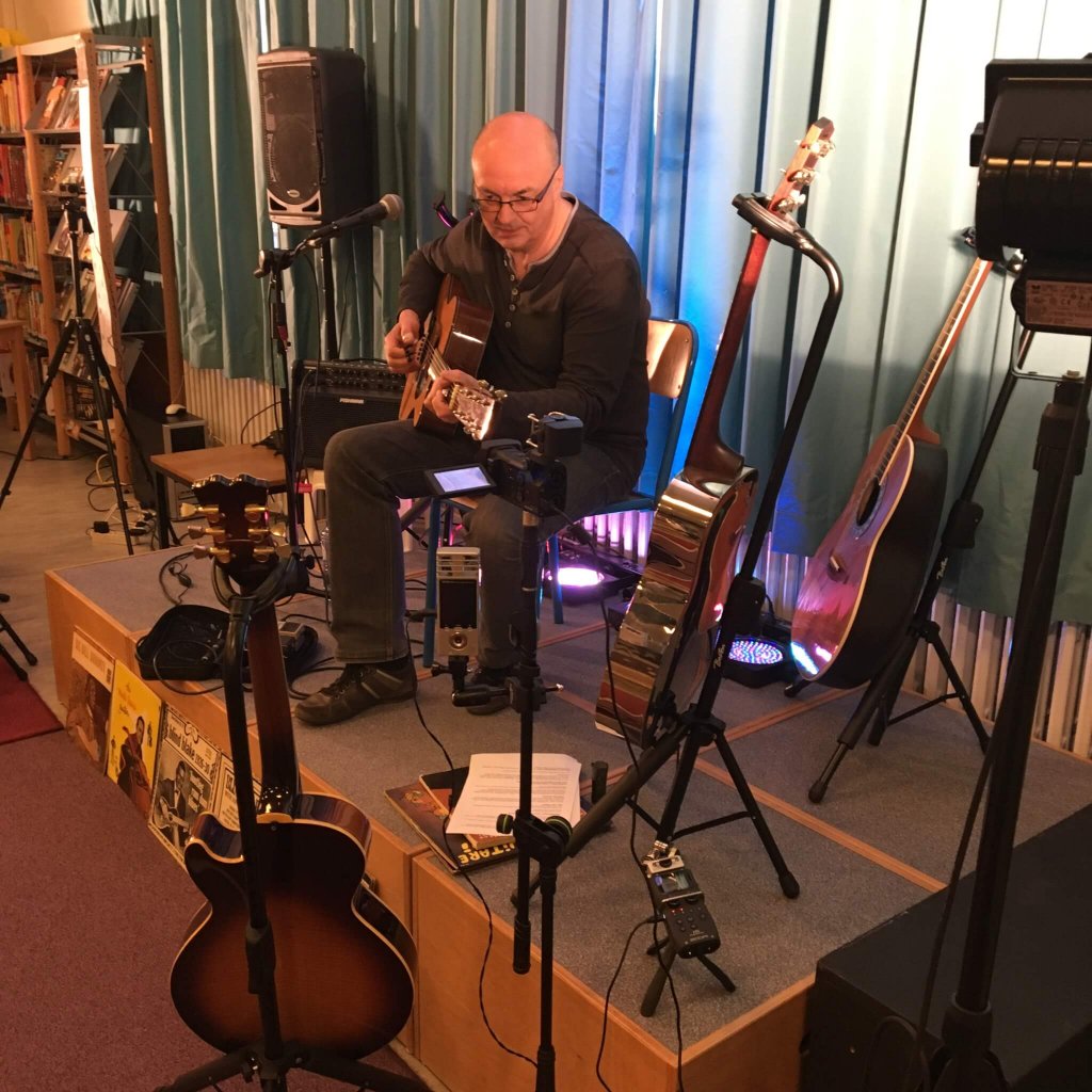 Écouter Jacques Stotzem parler des pères de ses pairs et de la genèse de la technique fingerpicking est une chance. Les organisateurs de cette conférence « Fingerpicking Roots » ont dû refuser beaucoup de monde. J’ai eu la bonne idée de sortir les caméras pour filmer cette soirée exceptionnelle. Cette vidéo permettra à ceux qui n’ont pas eu la chance d’y assister en live de voir et surtout d’entendre tout ce qui s’est dit ce soir là. En deux heures, emmené par un orateur éclairé et passionné, on passe du Blues au fingerpicking moderne.
