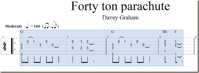 Voyons les 4 premières mesures du morceau “Forty ton parachute” de Davey Graham. Il s’agit d’un arrangement de Jacques Stotzem.