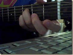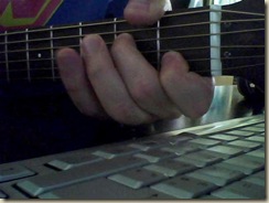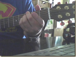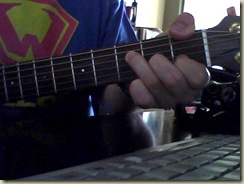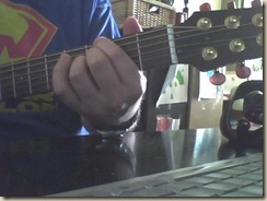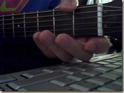 Une position interessante, mais il va falloir opérer un basculement important de la main pour faire le hammer-on sur la corde de Si, ce qui va nous obliger à interrompre le son de notre accord un rien trop tôt. |