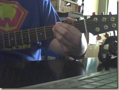 Index et majeur, comme un accord de C en omettant la note de Do sur la basse de La. (C’est la position suivante qui nous indique d’omettre cette note).