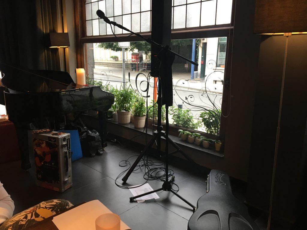 Quand je joue, j’écoute ce que je joue, mais je perçois aussi distinctement le son de ce qui m’entoure. Les discussions dans la salle entrent et sortent de mes oreilles. J’en attrape des bribes au passage. J’imagine qu’un interprète qui parle et écoute en même temps ressent la même chose. Le public du vendredi : un couple de beaux hipsters, des jeunes filles fraîchement célibataires sur de jolis talons, un couple de mecs, une dame qui boit un verre avant d’aller bosser et d’autres tables sans histoires.
